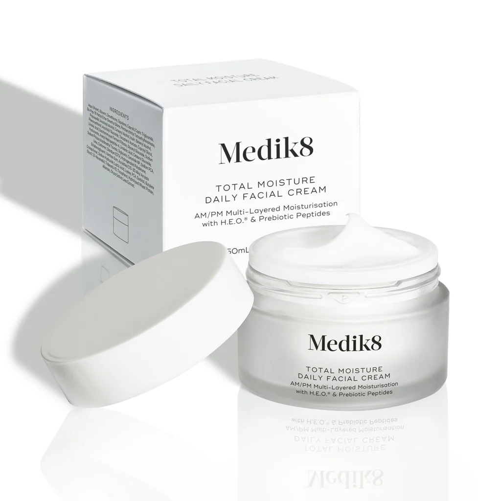 Total Moisture Daily Facial Cream es la crema facial diaria de Medik8 que ofrece una hidratación profunda e instantánea. Esta crema hidratante diaria está formulada para proporcionar 100 horas de hidratación* y apoyo clínicamente comprobado a la barrera cutánea y al microbioma. Su fórmula ligera pero intensa combina ácido hialurónico de múltiples pesos y un péptido prebiótico único que fortalece la barrera cutánea. Ideal para uso tanto por la mañana como por la noche, esta crema mantiene la piel flexible, luminosa y perfectamente hidratada sin dejarla grasa. También disponible en envase de recambio reciclable para un cuidado más sostenible.